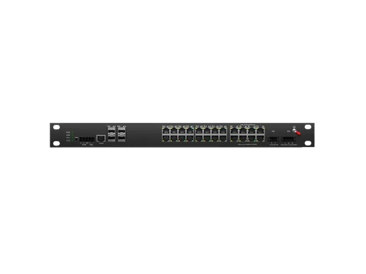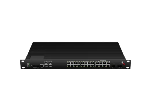 Interruptor de montagem em rack industrial L3 Lite gerenciado PoE 24x100/100/1000M RJ45 PoE , Uplink 4x10G SFP Entrada DC48-58V redundante |